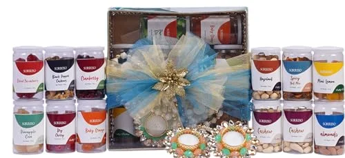 The Gift Tree Diwali Gift Hamper, Diwali Dry Fruits With Gemstone Diya, Diwali White Bead Toran With Beautiful Square Metal Basket, Diwali Hamper For Family, Friend, Corporate Office, Clients