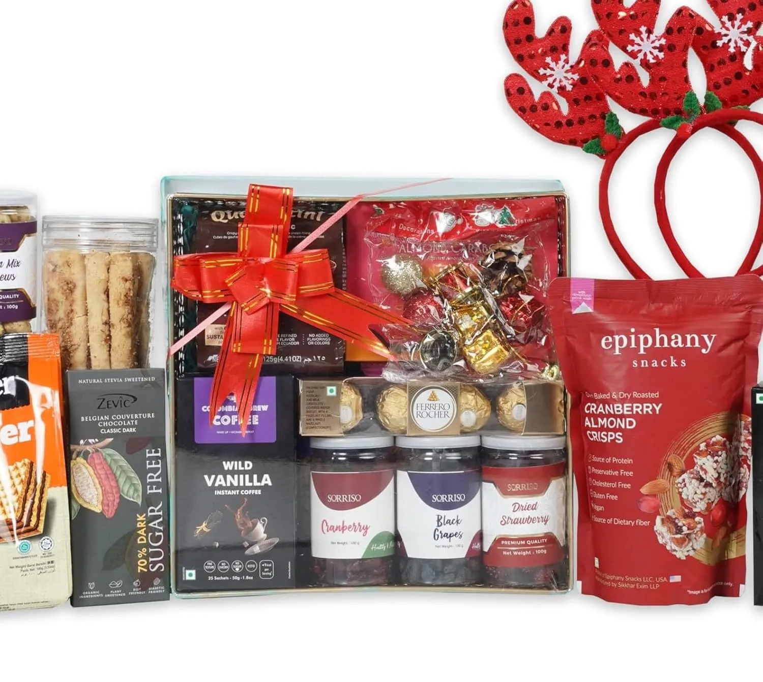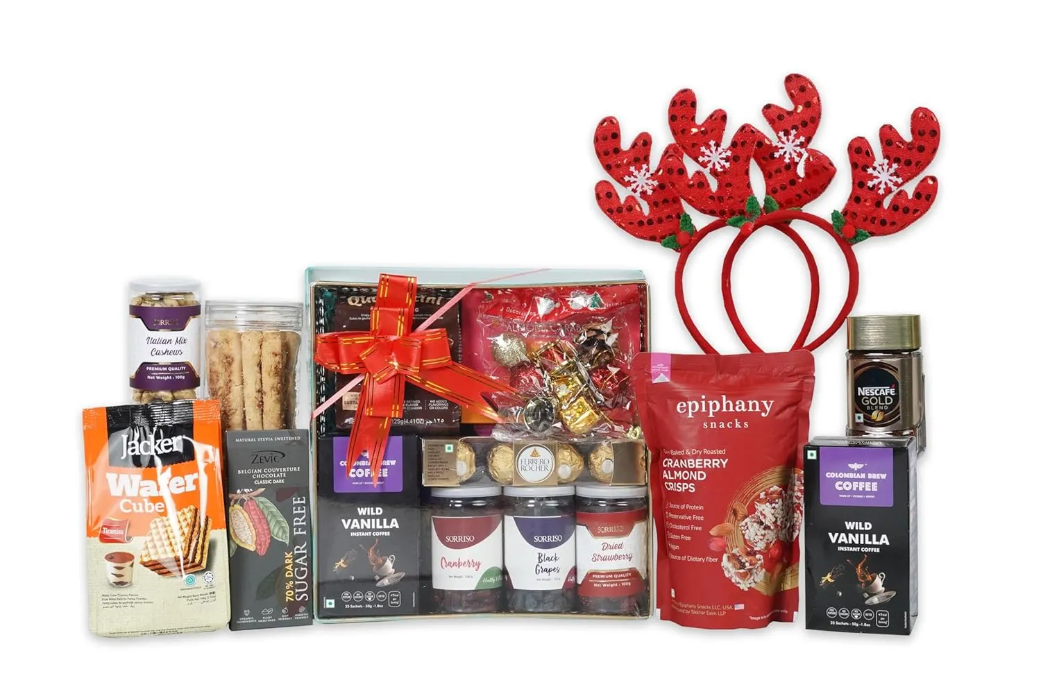 ● Make your celebrations special with The Gift Tree Hampers – loaded with Nescafe Gold Imported Premium Coffee,Colombian Brew Flavoured Instant Coffee,Epiphany Almond Cranberry Crunch,Sorriso Italian Mix Cashew,Zevic Belgian Dark Chocolate Sugar Free With Fruits & Nuts,Christmas Theme Headband Set Of 2,Bake Live Almond Sticks Cookies,Jacker Waffer Cube,Square metal Basket with handle,Message Card