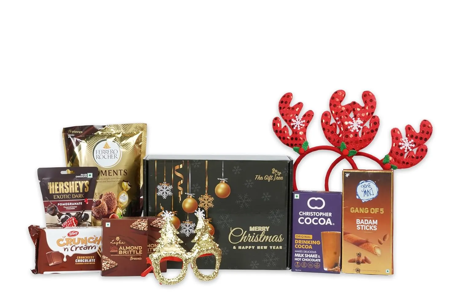 ● Make your celebrations special with The Gift Tree Hampers – loaded with Christopher Cocoa, Drinking Chocolate Cocoa Powder,Christmas Theme Goggles,Christmas Theme Headband Set Of 2,Ferrero Rocher Moments 46.4 gm,Tiffany’s Crunch n Cream Chocolate Waffer,Hershey’s Exotic Dark Pomegranate,Gery- Gone Mad Premium Almond Sticks,Loyka Almond Brittle Brownie Dark Chocolate Praline,Loyka Almond Brittle Brownie Dark Chocolate Praline,Merry Christmas Black Box,Message Card