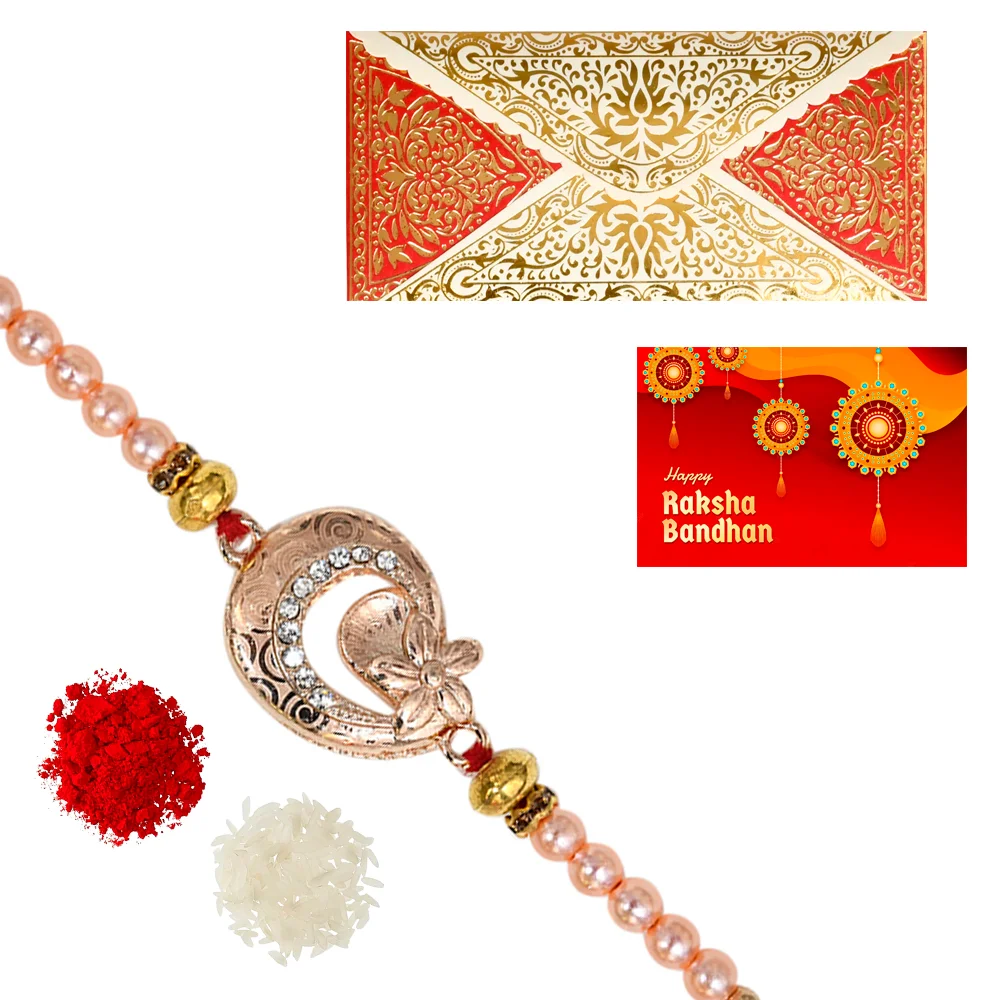 The Gift Tree Golden Moon Star Beads Rakhi For Brother With Roli, Chawal and Beautiful greeting card | Premium Rakhi for Men, Kids & Boys
