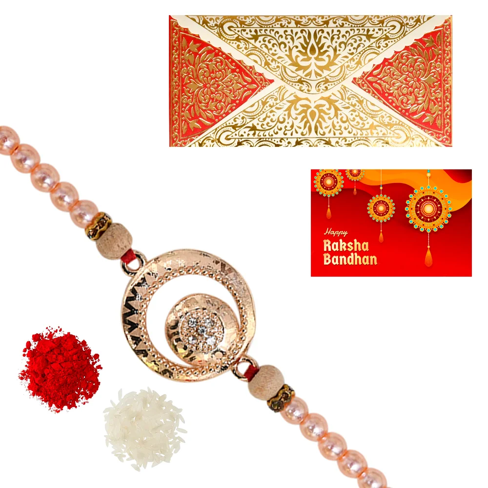 The Gift Tree Golden Round Designer Pearl Rakhi For Brother With Roli, Chawal and Beautiful greeting card | Premium Rakhi for Men, Kids & Boys