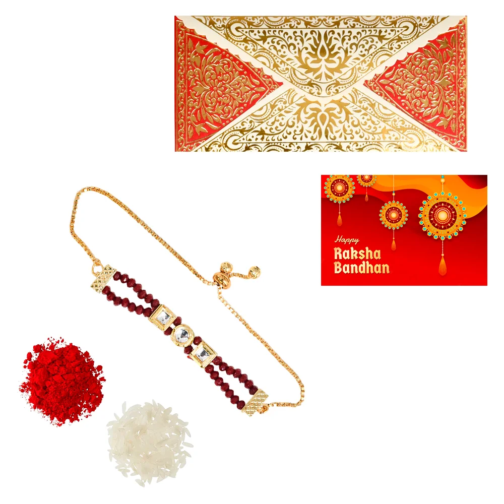 The Gift Tree Golden Shaped Maroon Beads Rakhi For Brother With Roli, Chawal and Beautiful greeting card | Premium Rakhi for Men, Kids & Boys