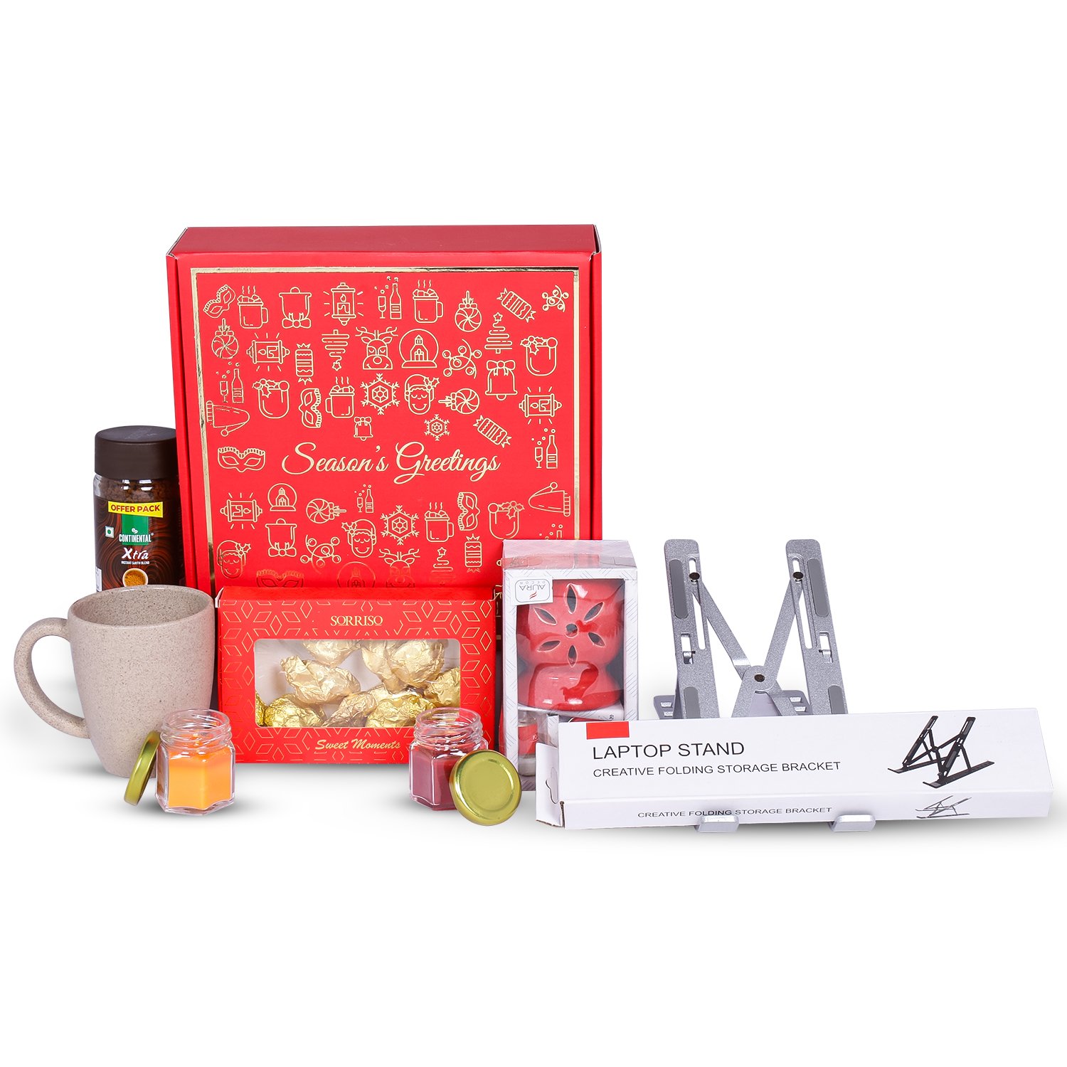 ● Make your celebrations special with The Gift Tree Hampers – loaded with Laptop Stand Foldinig Storage Bracket ,Sorriso Premium Handmade Almond Rocks,Rice Husk Mug ,AuraDecor Gift Pack of 6 Bees Wax Acrylic Tealight Candle,continental coffee ,Decorative Handmade Scented Jar Candle 2 inch – Set of 2,Gift Message Card,Season’s Greetings Red gift box