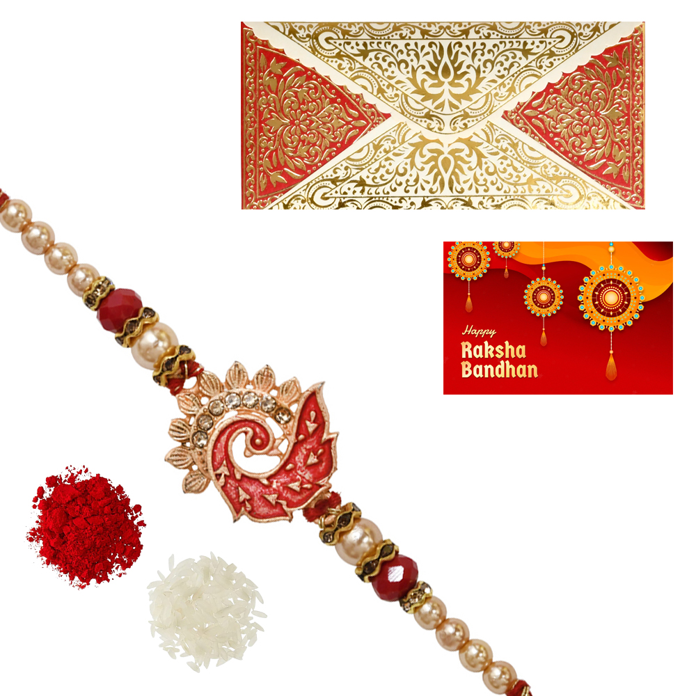 The Gift Tree Red Peacock Design Golden Beads Rakhi For Brother With Roli, Chawal and Beautiful greeting card | Premium Rakhi for Men, Kids & Boys