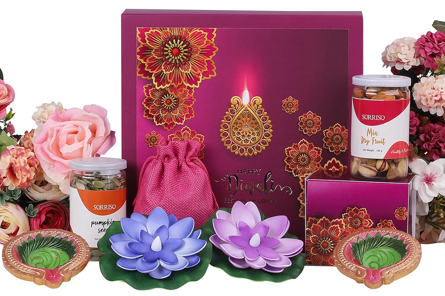 The Gift Tree Special Diwali Gift Hamper | Almond Rocks, Floating Led Candles, Pumpkin Seeds & Colourful Diya| Gift For Festival Celebration, Family, Friends, Corporate Office