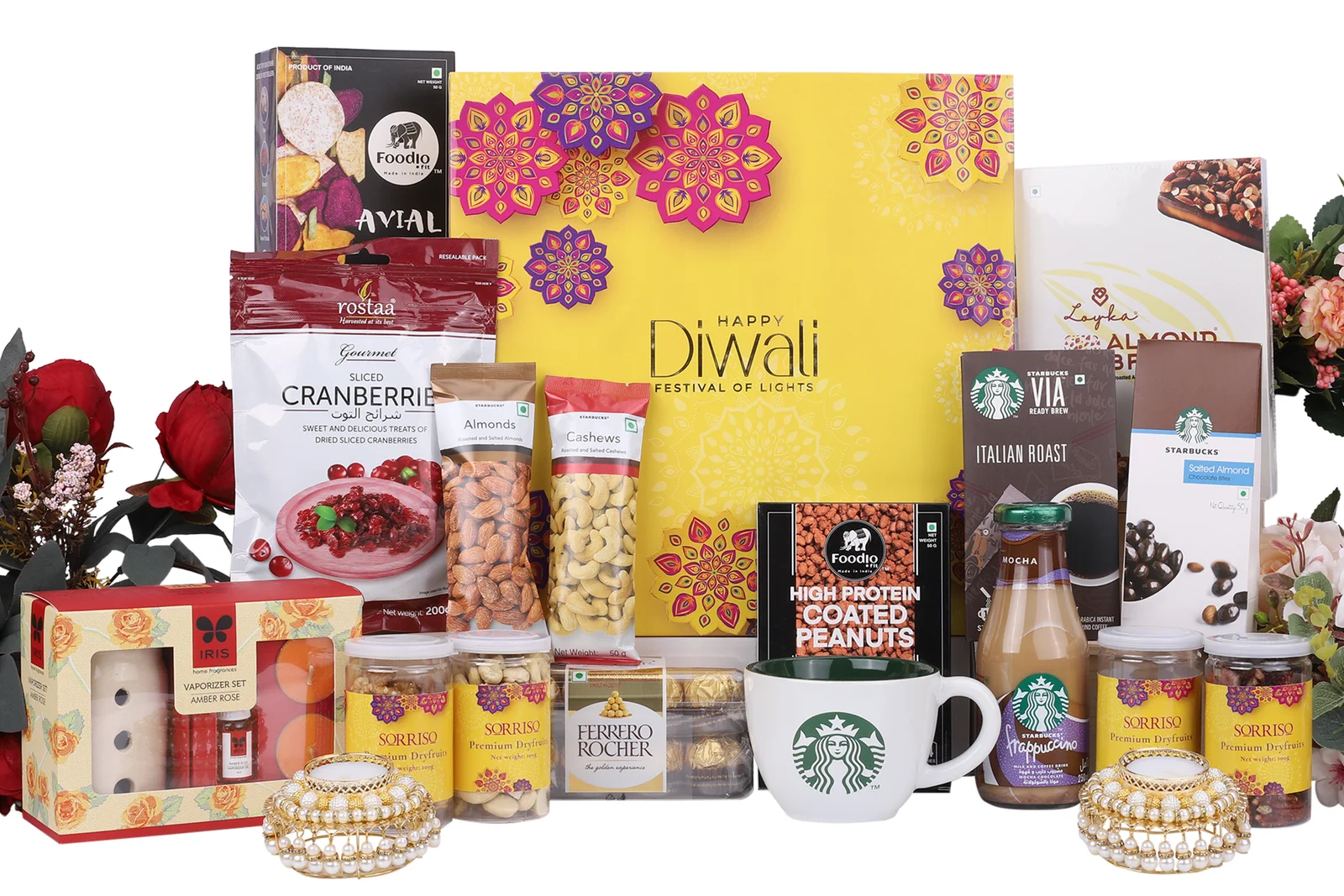 Engraved White and Green Mug-300 ml, Italian Roast Ready Brew coffee-25g,Ferrero Rocher Hazelnut Chocolates-200 g,Almond Brittle Handmade Praline chocolate192g, Frappuccino Mocha chocolate250ml,Rostaa Gourmet Sliced Cranberries-200g,Iris Vaporizer Burner Set with Ceramic Burner, candles & Fragrance- Amber Rose,Sorriso Flavoured Almonds-100g,Sorriso Flavoured Cashews-100g,Sorriso Hazelnut-100g,Sorriso Dried Fruit Goji Berry-100g