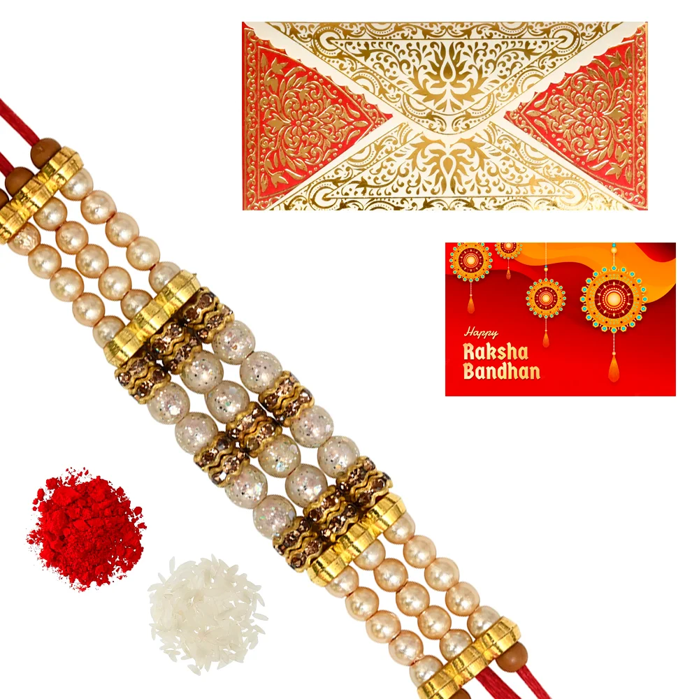 The Gift Tree White And Golden Pearl Rakhi For Brother With Roli, Chawal and Beautiful greeting card | Premium Rakhi for Men, Kids & Boys