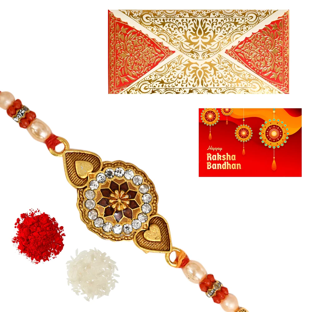 The Gift Tree White Diamond Golden Floral Rakhi For Brother With Roli, Chawal and Beautiful greeting card | Premium Rakhi for Men, Kids & Boys